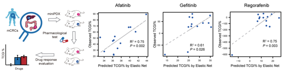 此项研究的另外一个重要成果是突破精准医学靶向治疗对基因突变的依赖,直接针对作为药靶的蛋白质进行筛选。研究人员首先基于配对的原发灶-转移灶的蛋白质组/磷酸化蛋白质组数据,量化分析了激酶与底物相互作用网络;通过激酶活性富集、激酶底物相关性网络分析了蛋白质亚型之间,原发灶和转移灶之间的异质性。在此研究基础上,研究人员建立了来自22位结直肠癌患者的31个人源性肿瘤异种移植模型,并进行了三种激酶靶向药物(Afatinib、Gefitinib和Regorafenib)的药敏实验,验证了来自同一患者的原发灶和转移灶对同一药物表现出不同的反应。研究结果表明,对于转移性肿瘤的治疗不仅是个性化的,甚至是位置特异的。更重要的是,在药敏模型对应的肿瘤组织中,三种药物靶向基因几乎没有发生相关突变,然而,一些肿瘤组织却显示出良好的药物敏感性,这表明在指示药物敏感性方面,激酶底物相关性网络的判别可能比基因突变存在与否更为敏感和直接。通过构建激酶-底物网络的机器学习模型,该研究为药效判别提供了准确的预测,从而为癌症个性化用药提出了超越基因组分析的新方向。