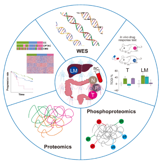 研究团队系统性地收集了转移性结直肠癌患者480个临床样本,包括原发灶与相应的转移灶,近端癌旁组织及远端正常组织;然后对这些样本分别进行了全外显子测序、甲基化芯片、定量蛋白质组和磷酸化蛋白质组等多组学数据采集。通过这些临床大数据分析以及与西方人数据集的比较,研究人员绘制了首个中国人结直肠癌及转移相关的多组学整合图谱。