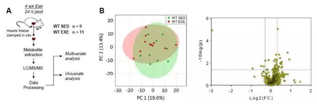 首先,研究人员训练了一批小鼠,连续在跑步机上高强度运动了4周。训练过的小鼠不仅运动能力提高了,一型胰岛素样生长因子水平比不运动的小鼠提高了15%,而且心脏呈现出了明显的生理生长。随后,他们使用非靶向代谢组学技术,比较了运动与不运动的小鼠之间的代谢系统,却发现两类小鼠间的代谢组几乎没有差异。。。