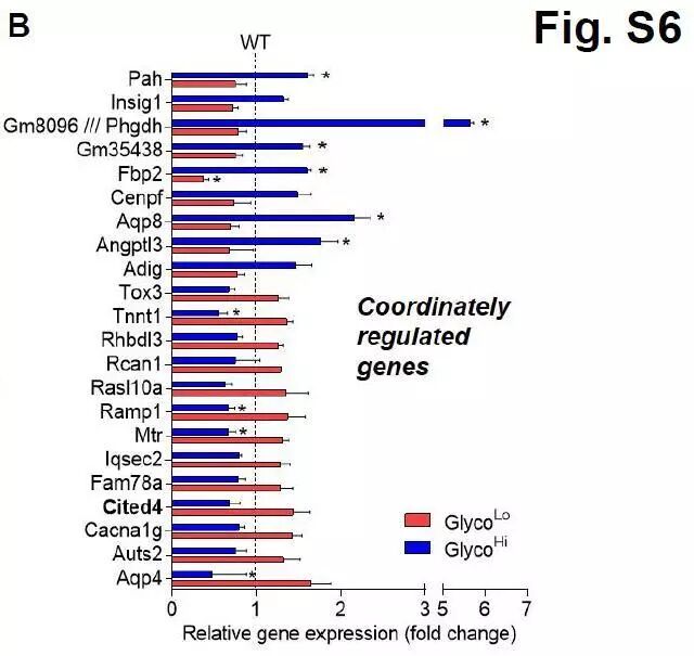 看到这个现象,研究人员又提出了新的问题,既然GlycoLo和运动小鼠有相似的心脏表型特征,那是不是GlycoLo也有高于WT的运动能力呢?为了搞清楚这个问题,新一轮的运动训练又开始了(替小鼠心累)。。。GlycoLo和WT小鼠又在跑步机上锻炼了4周。。。然而,GlycoLo并没有表现出优于WT的运动能力。但是不同于WT小鼠在运动后呈现的心脏生理生长,GlycoLo的心脏没有再增大。这说明持续低水平的糖代谢速率可以最大程度地刺激心脏的生理性生长。此后,研究人员又对比了GlycoLo、GlycoHi和WT的转录组,糖代谢水平的差异会导致转录水平发生普遍变化。
