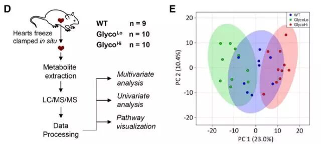 随后,研究团队比较了三种不同基因型的小鼠:GlycoLo、GlycoHi和WT。与WT(野生型)相比,GlycoLo和GlycoHi分别降低或提高了PFK1的活性和心肌糖代谢速率。通过代谢组学分析,与WT相比,GlycoLo和GlycoHi分别有108个和109个代谢物呈现出显著差异。