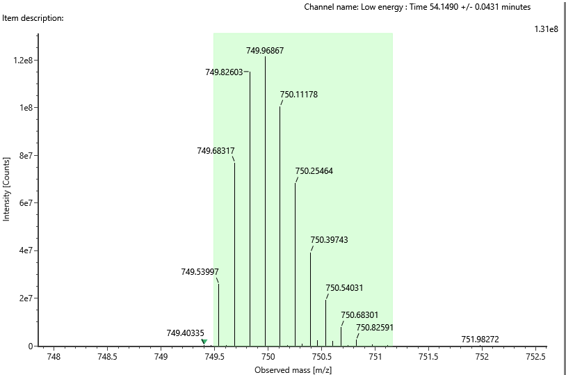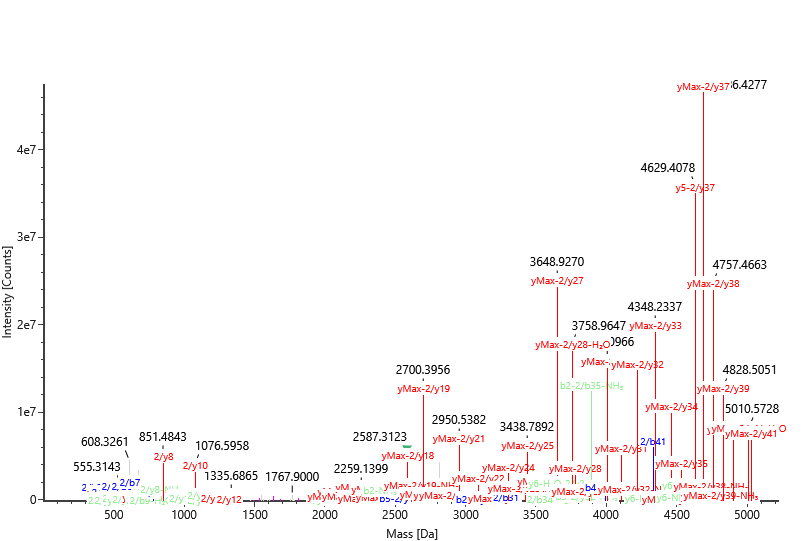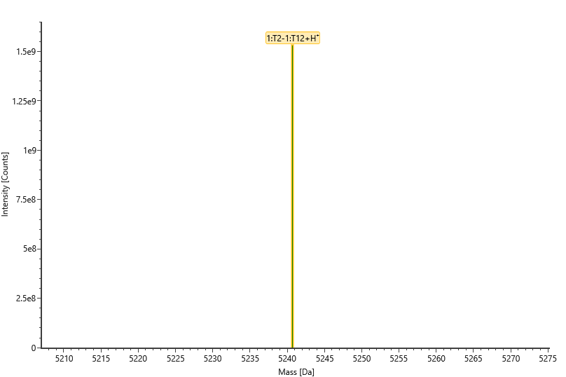 然后通过二硫键所在肽段的一级及二级质谱信息图谱,将实际测到的肽段的分子量与理论的分子量进行比对来确认二硫键的连接方式;通过二级谱图的得分、电荷态以及保留时间等限制条件能进一步提高分析结果的准确度。